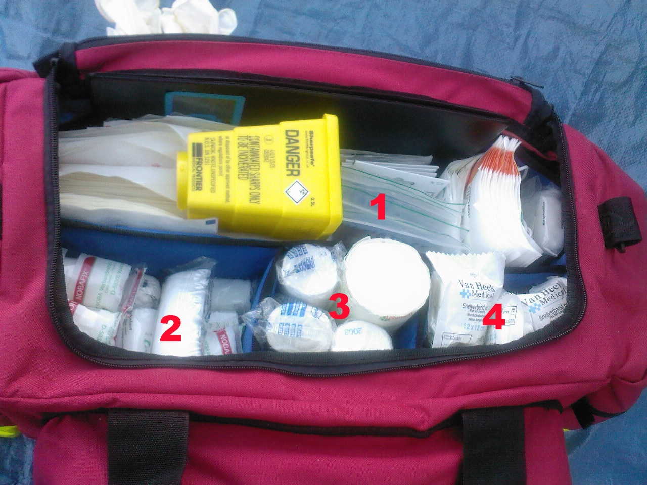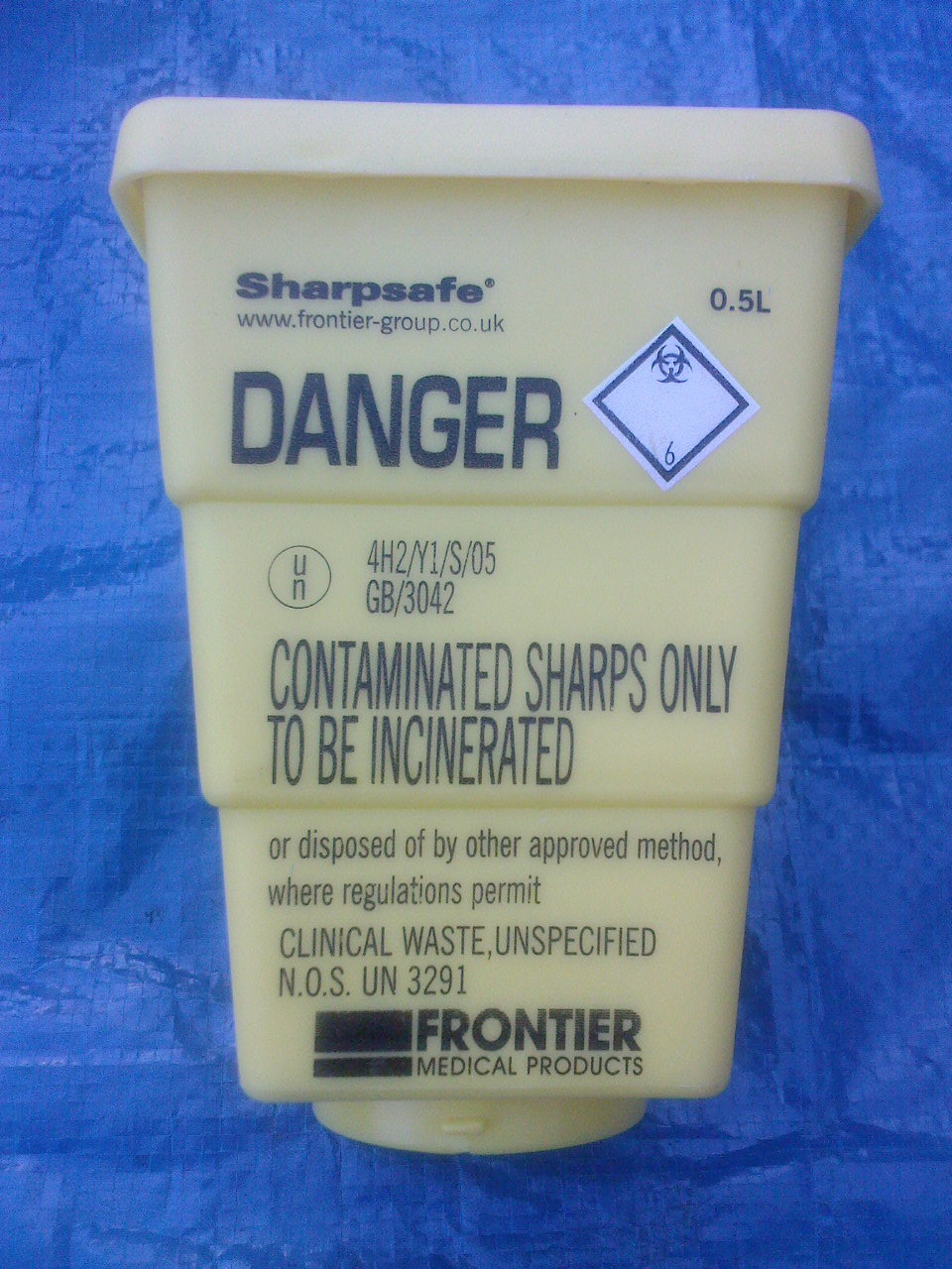 Foto rechts : Naalden container voor vuile naalden en blarenprikkers.