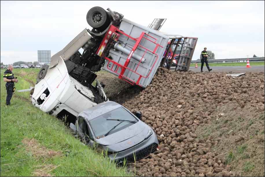 Auto met suikerbieten gekanteld op de A59 en in de sloot beland ,