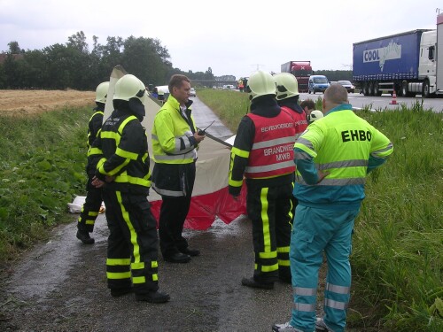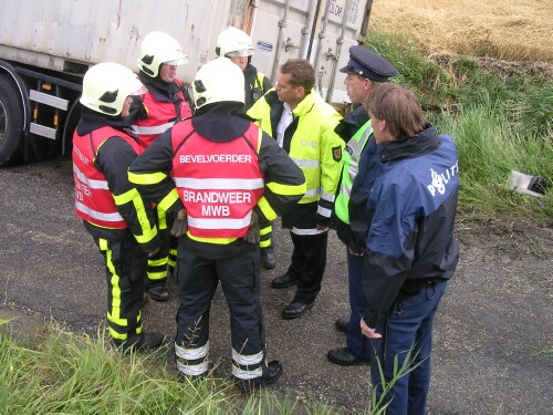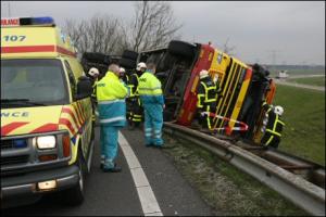 bestuurder om hem naar de brandweerwagen te brengen.