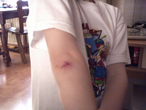 iemand gevallen , een kleine schaafwond op de knie was het gevolg.