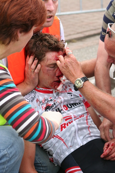 Links ) Gewonde wielrenner met aangezichtsletsel.